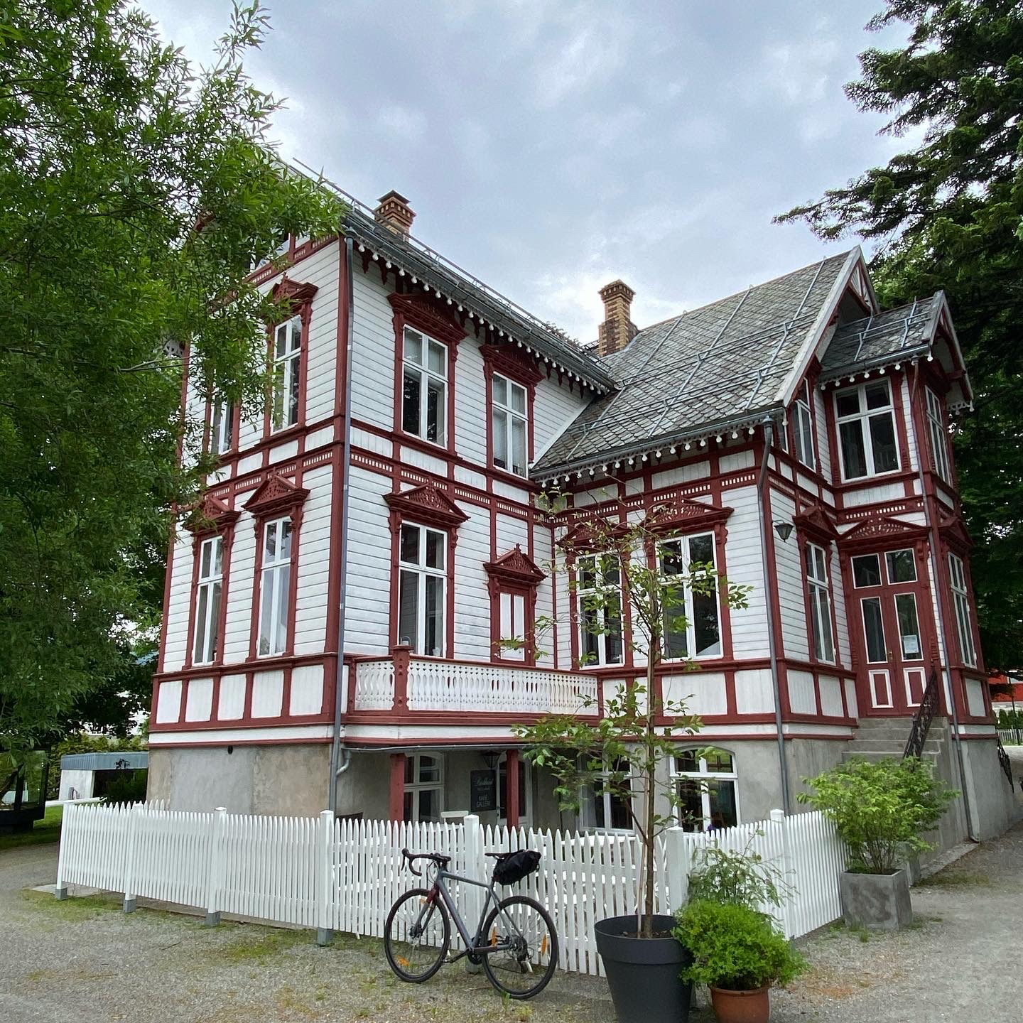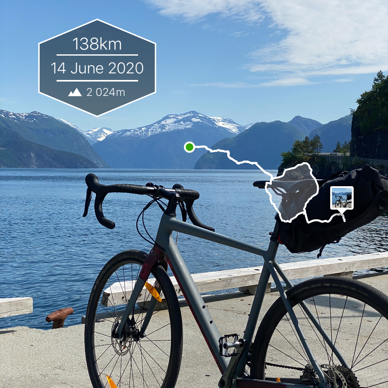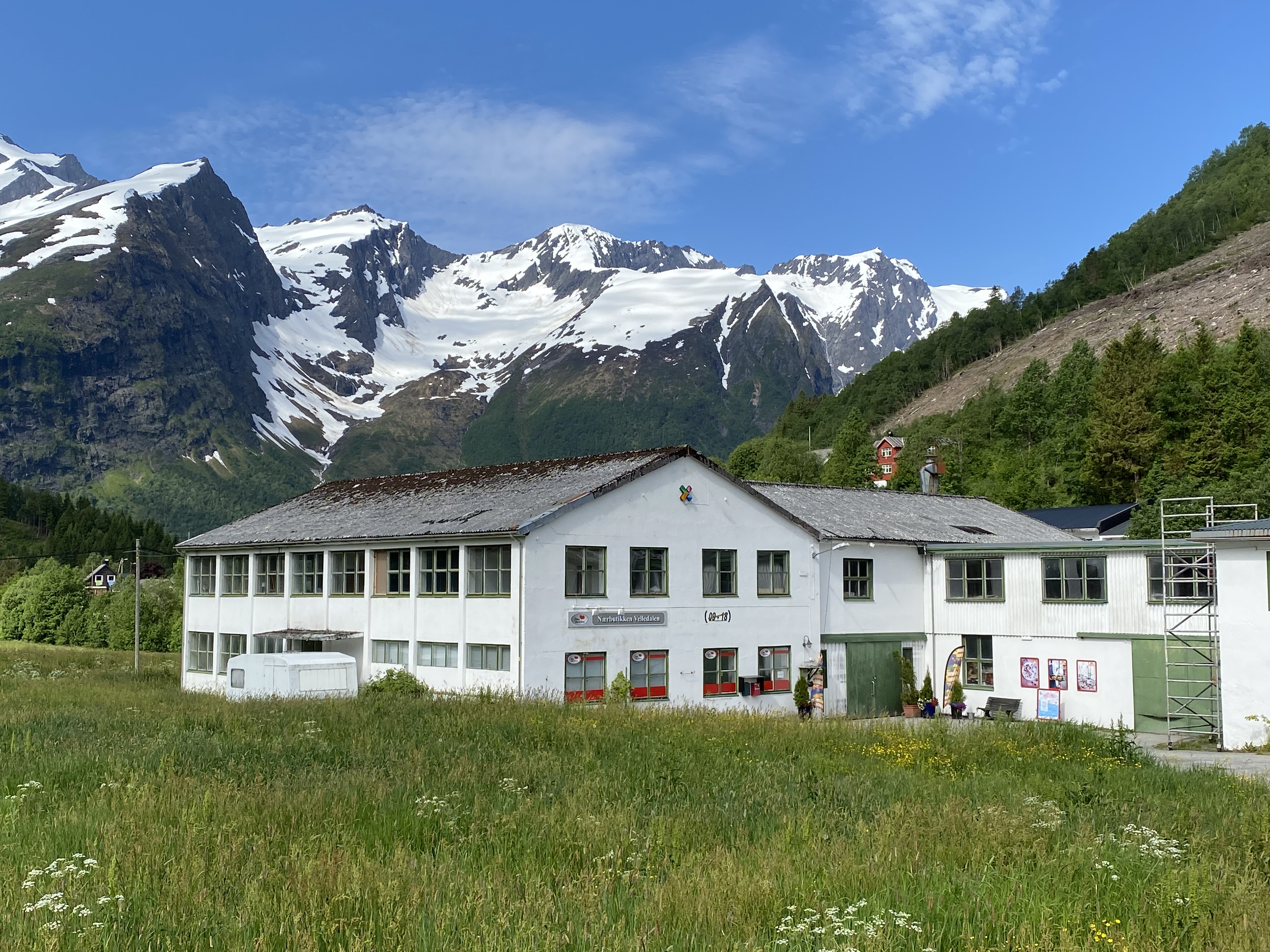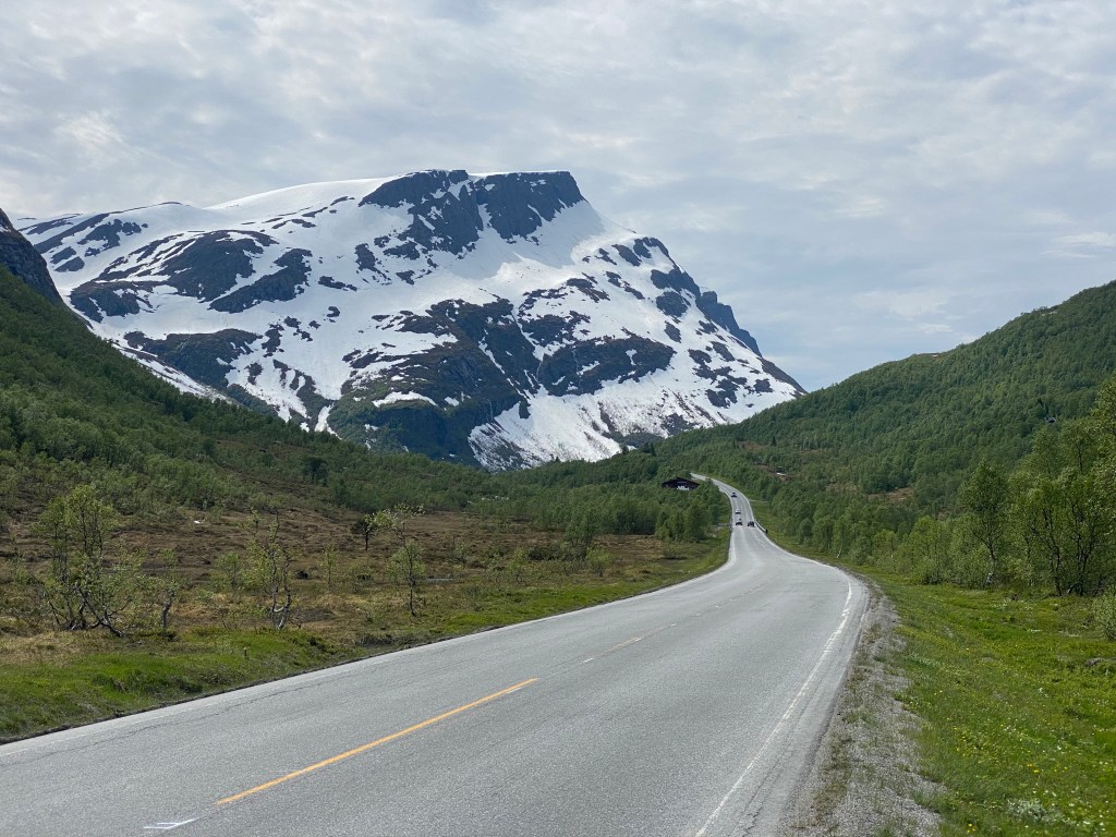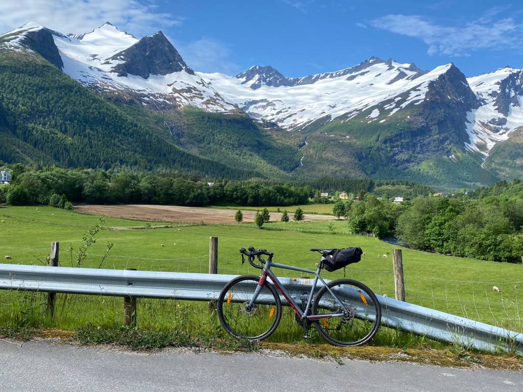 From here the next part is on the main road, still climbing a bit. You’ll pass Strandafjellet Ski Resort before you can enjoy rolling the road all the way down to Stranda. This is a beautiful village situated in a green slope by Storfjorden, between snowy mountains. If you’re lucky you’ll find the cafe Hygge open. This is a meeting point for mountaineers, alpinists, climbers, hikers and bicyclists.